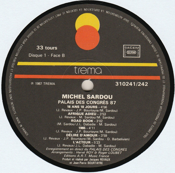 | Titre Label et référence Support Pays Date Particularités | Palais des congrès 87 Trema 310 241 / 242 LP, Original France 1987 Avec ou sans mention "Extraits" |